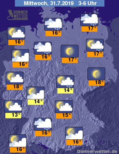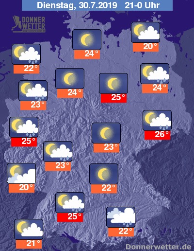 Die Temperaturen bewegen sich am frühen Abend zwischen hochsommerlichen 27 und 32 Grad, zum Teil ist es dabei schwül, angenehmer bleibt es an den Küsten von Nord- und Ostsee, sowie auf den Inseln.