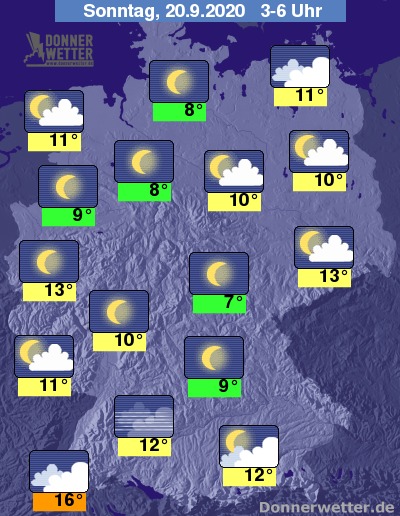 In der kommenden Nacht bleibt es am Oberrhein und im äußeren Nordosten Deutschlands wolkenverhangen, jedoch weitgehend trocken. Im übrigen Land ist es meist sternenklar oder es ziehen nur lockere, teils auch noch aufgelockerte Wolken durch, dazu bleibt es trocken. Die Temperatur sinkt auf 16 Grad im Breisgau und bis etwa 7 Grad im Eichsfeld.