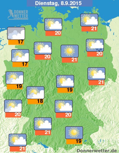 Heute ist es häufig heiter bis sonnig, vor allem im Westen, Nordwesten und Osten des Landes ziehen jedoch auch teils dichte Wolken durch, dabei sind im Osten einzelne Schauer möglich, sonst bleibt es jedoch weitgehend trocken. Die Temperatur steigt auf 17 Grad entlang der Ems und bis auf spätsommerliche 21 Grad im Oberrheingraben.