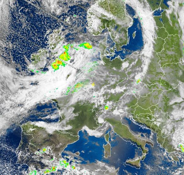 Auf dem Satellitenfoto von heute Morgen lag vor allem England unter kompakten Wolken aus denen es zum Teil kräftig und ergiebig regnete. Diese Wolken gehören zu einem Tief nordöstlich von Großbritannien über der Nordsee.