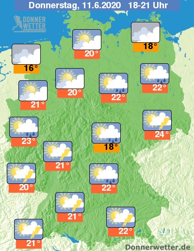 Am Abend wechseln sich Sonne und Wolken miteinander ab und es gehen örtliche Regengüsse und Gewitter nieder. Im Nordwesten, sowie in Küstennähe bleibt es meistens trocken.