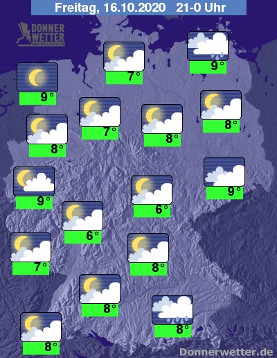 Bis Mitternacht zieht sich der Regen im Süden an die Alpen zurück, gleichzeitig nimmt die Bewölkung an der mecklenburgischen Ostsee zu und es kann stellenweise tröpfeln oder nieseln. In den anderen Gebieten bleibt es wechselnd bewölkt. Im westlichen Niedersachsen leuchten die Sterne häufiger.