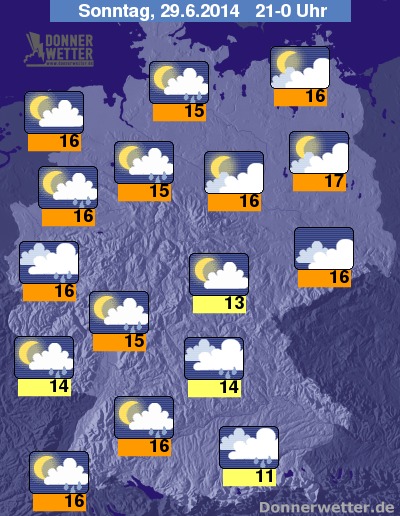 In der Nacht zum Montag lassen die Schauer meist nach und es bilden sich nur vereinzelt Schauer, nach Südosten fällt aus dichten Wolken aber zeitweise Regen, sonst lockert die Bewölkung besonders nach Westen und Nordwesten häufig auf. Die Temperatur sinkt auf 12 Grad in Dresden und 7 Grad an der Fränkischen Alb.