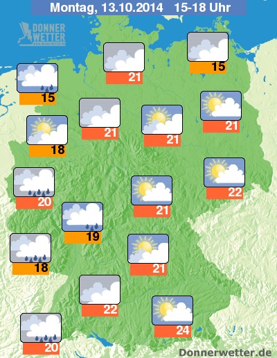Heute Nachmittag ziehen besonders im Nordwesten und im Südwesten dichte Wolken durch, die hier und da auch für einzelne Schauer, vereinzelt auch für Gewitter sorgen können. Auch in den anderen Landesteilen ist es häufig stark, vor alelm nach Osten und Südosten hin aber auch aufgelockert bewölkt, dabei bleibt es weitgehen trocken. Die Temperatur liegt bei 15 Grad in Rostock und etwa 24 Grad in München.