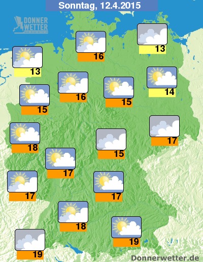 Am Sonntag wechseln sich Sonne und Wolken aneinander ab, dabei können bevorzugt im Osten und Südosten auch kompakte Wolken durchziehen, es bleibt jedoch überall trocken. Die Höchstwerte liegen bei 13 Grad in Rostock und 19 Grad am Bodensee.
