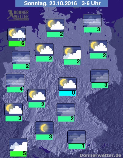 In der Nacht zum Sonntag ist es im Nordseeumfeld verbreitet stark bewölkt bei möglichen Regenfällen. Im übrigen Norden ist es oft stark, teilweise aber auch aufgelockert bewölkt und zum Großteil trocken. Von der breiten Landesmitte bis in den Süden zeigt sich ein häufig sternenklarer Nachthimmel, jedoch sind hier und da auch einige, teils auch dichte Wolken möglich, dabei bleibt es aber trocken. Stellenweise kann sich Nebel oder Hochnebel bilden. Die Temperatur sinkt auf 6 Grad an der Nordsee und bis 0 Grad im Grabfeld.