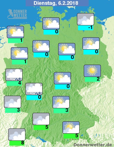 Im Bereich der Ostsee kann es durch den „Lake Effekt“ noch zu örtlichen Schneeschauern kommen. Im Südwesten halten sich dichtere Wolken und vor allem im Saarland und in Teilen von Rheinland-Pfalz fällt gelegentlich Schnee, vereinzelt auch gefrierender Regen. Mit Straßenglätte muss gerechnet werden. Sonst scheint neben örtlichen Wolkenfeldern auch für längere Zeit die Sonne. Die Höchsttemperaturen bewegen sich dabei wieder zwischen -2 und 4 Grad. In Baden-Württemberg, sowie am Oberrhein steigt das Quecksilber auf mildere 5 bis 9 Grad. Der Wind weht meist nur schwach bis mäßig. In der Nacht gibt auf Mittwoch gibt es verbreitet wieder Frost, gebietsweise unter -5 Grad.