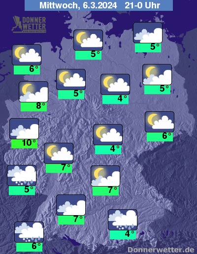 In der Nacht auf Donnerstag setzen sich Regen- und Schneefälle im Süden anfangs noch fort, im weiteren Verlauf nachlassend. Sonst bleibt es bei teils wolkigem, teils nur gering bewölktem Himmel weitgehend niederschlagsfrei. Lokal kann sich Nebel bilden.