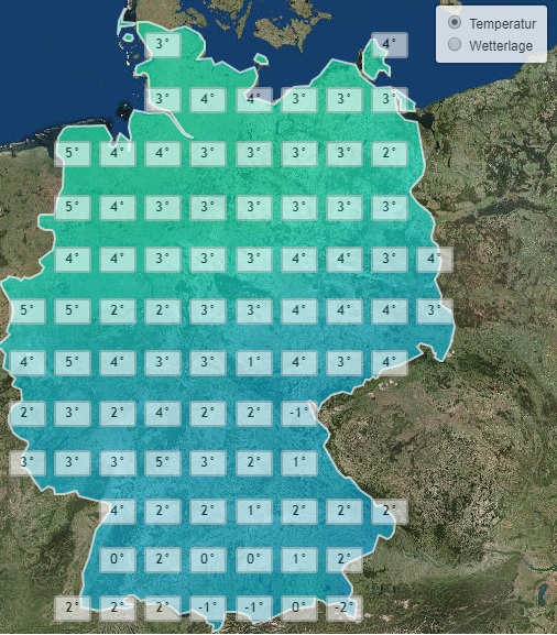 Die Höchstwerte liegen dabei in der Regel noch etwas niedriger als an den vorangegangenen Tagen. Zwischen Niederrhein und Nordsee reicht es am Nachmittag zumindest noch für Temperaturen um die 5 Grad, im südlichen Bayern und Baden-Württemberg liegen die Höchstwerte hingegen um den Gefrierpunkt oder sogar leicht darunter.
