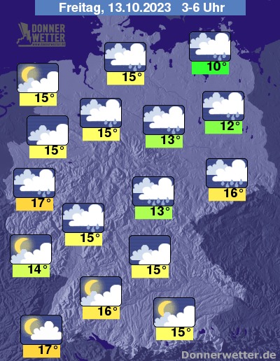 In der Nacht zum Freitag bringen kompakte Wolken weiten Landesteilen häufigen und teils langanhaltenden Regen. Südlich des Mains kann es dagegen vielerorts auflockern, hier bleibt es weitgehend trocken. Die Temperatur sinkt auf 17 Grad in Köln und bis 10 Grad in Neubrandenburg.