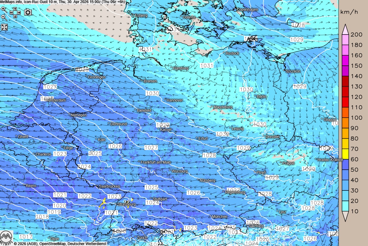 Die Wetter-, Temperatur- und Böenkarte für Donnerstagnachmittag (15:00 Uhr) nach ICON-RUC: