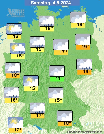 Am Samstag zeigt sich der Himmel verbreitet wechselnd oder stark bewölkt, dabei sind zunächst nur selten einzelne Schauer möglich. Im Tagesverlauf kommt dann im Westen und Südwesten sowie im Osten und Südosten teils schauerartiger Regen auf, auch lokale Gewitter sind möglich. Dazwischen bleibt es heute überwiegend trocken.