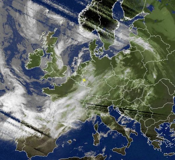 Auf dem Satellitenfoto von heute Morgen sind die sehr kompakten Wolken über der Nordhälfte der Iberischen Halbinsel, sowie über weiten Teilen Frankreichs zu erkennen. Sie gehören zu einem kräftigen Tief über der Biskaya und bringen verbeitet sehr unbeständiges Wetter mit oft starken und ergiebigen Niederschläge, sowie Gewittern mit Hagel und möglichen Sturmböen.