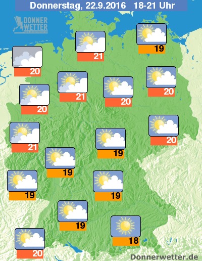 Die Temperaturen liegen in den späteren Abendstunden bei Werten um 18 Grad im Chiemgau und um 21 Grad C entlang der Weser und sinken in der ersten Nachthälfte auf 17 Grad C in Ostfriesland und um 9 Grad C im Saarland.