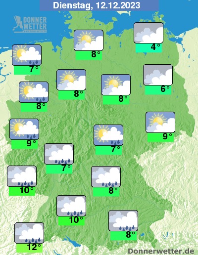 Die Temperaturen bleiben mit Höchstwerten um 7 bis 12 Grad sehr mild, am kältesten bleibt es im äußersten Nordosten Deutschlands.