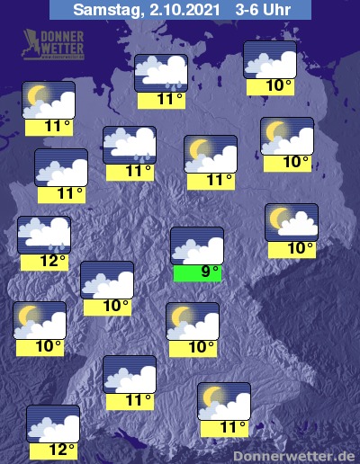 In der Nacht zum Samstag zieht ein schmales Regenband über den Westen, Nordwesten und Norden Deutschlands hinweg, dabei fällt hier und da leichter Regen. Im übrigen Land ist es oft stark, teils aber auch aufgelockert bewölkt, im Südosten und über Sachsen anfangs noch meist locker bewölkt, dazu bleibt es trocken. Die Temperatur sinkt auf 12 Grad am Oberrhein und bis 9 Grad im Eichsfeld.