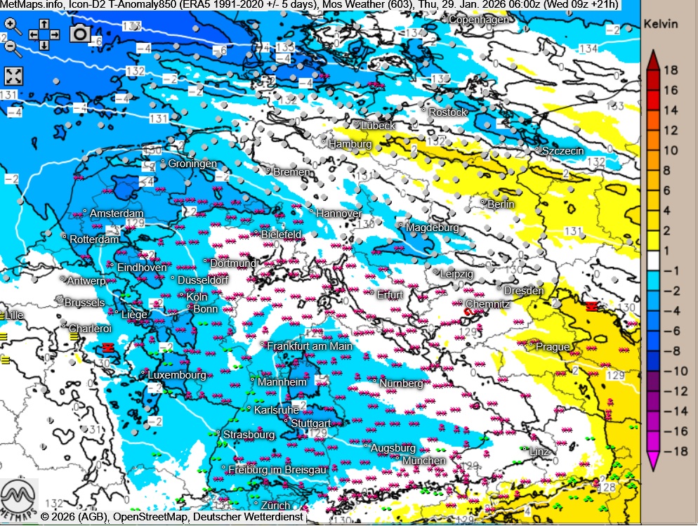Die Wetterkarte und Temperaturabweichung für Donnerstagmorgen (06:00 Uhr) sowie die 24-Stunden-Schneemengen nach ICON:
