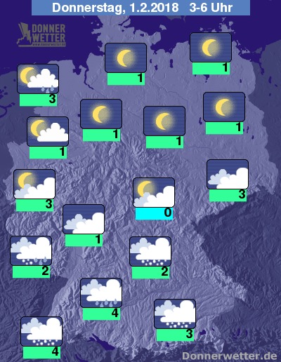 Am Donnerstag ist es vor allem im Süden oft nasskalt mit Schnee-, Schneeregen- oder Regenschauern. Auch im Küstenumfeld und teils über der breiten Mitte des Landes ist es oft stark bewölkt, dabei ist es aber meist trocken. Vor allem von Sachsen bis nach Niedersachsen scheint auch immer wieder mal die Sonne zwischen den Wolken, hier bleibt es überwiegend trocken. Die Temperatur erreicht 3 bis 6 Grad.