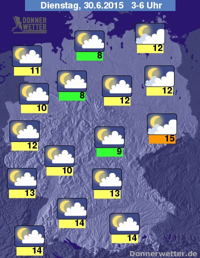 In der Nacht zum Dienstag zeigt sich der Himmel im Osten und Nordosten des Landes oft aufgelockert und teils auch stark bewölkt, dabei bleibt es aber trocken. In den übrigen Landesteilen ist es verbreitet locker oder aufgelockert bewölkt und dazu ebenfalls trocken. Die Temperatur sinkt auf 15 Grad in Dresden und bis 8 Grad in der Lüneburger Heide.