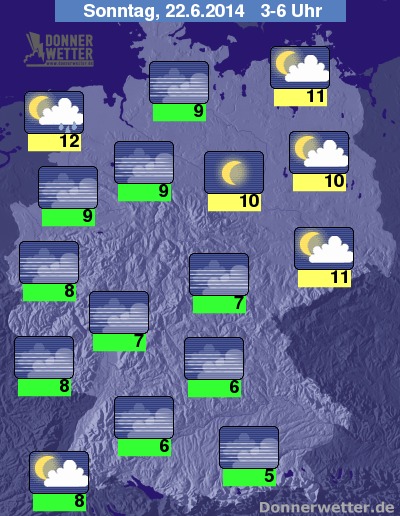 In der Nacht ist der Himmel häufig klar oder nur locker bewölkt, besonders im Norden und Nordosten können auch noch einige dichtere Wolken durchziehen, wobei es auch hier meist trocken bleibt. Gebietsweise kann es wiederum neblig-trüb werden. Die Temperatur sinkt bis zum Sonnenaufgang auf 12 Grad in Emden und etwa 5 Grad am Bayerischen Wald.