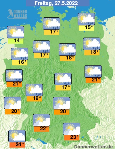 Am Freitag zeigt sich der Süden noch meist heiter, teils ziehen schon mehr Wolken durch, dabei bleibt es hier trocken. Über der Nordhälfte der Republik zieht oft dichte, teils auch lockere Bewölkung hinweg, dabei bilden sich gebietsweise Schauer. Die Temperatur steigt auf frische 14 Grad an der Nordsee und auf bis zu 24 Grad im Oberrheingraben.