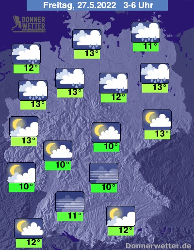In der bevorstehenden Nacht zieht ein Regenband von Norden her weiter Richtung Landesmitte, wobei es über der Südhälfte Deutschland bis zum Morgen noch trocken bleibt. Hier zeigt sich der Himmel meist nur locker bewölkt oder sternenklar, zum Morgen nimmt aber auch im Süden die Bewölkung langsam zu. Die Temperatur sinkt auf 13 Grad in Hamburg und 10 Grad in Nürnberg.