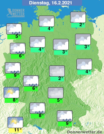 Heute bleibt es im Westen und Südwesten teils stark, teils aufgelockert bewölkt, vereinzelt ist etwas Regen möglich. Im übrigen Bundesgebiet ist es verbreitet neblig-trüb oder bedeckt, dabei bleibt es weitgehend trocken. Die Temperatur steigt auf 2 Grad an der Müritz und bis 11 Grad im Oberrheingraben.