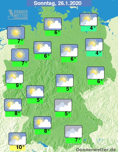 Am Sonntag heitert es in den westlichen Landesteilen immer weiter auf, über der Osthälfte des Landes bleibt es allerdings die längste Zeit des Tages noch stark bewölkt oder trüb, jedoch ebenfalls trocken. Die Temperatur steigt auf 4 Grad an der Oder und bis auf 10 Grad im Oberrheingraben.