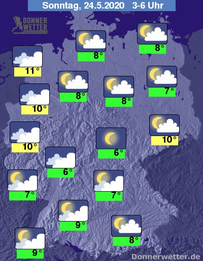 In der Nacht zum Sonntag klingen die Niederschläge auch im Süden immer mehr ab und der Himmel lockert und klart vielerorts auf. Gebietsweise ist es aber auch stark bewölkt, dazu bleibt es dann weitgehend trocken. Die Temperatur sinkt auf 11 Grad in Emden und bis 6 Grad im Grabfeld.