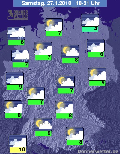 In der Nacht zum Sonntag ziehen dichte Wolken mit zeitweiligem Regen vom Nordwesten Deutschlands weiter südostwärts. Zum Morgen erreicht der Regen auch Sachsen, Thüringen und den Norden von Baden-Württemberg. Südlich davon bleibt es noch trocken. Die Temperatur sinkt auf 8 Grad an der Nordsee und 3 Grad im Münchner Umland.