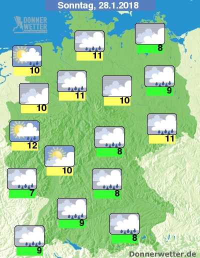 Am Sonntag halten sich größtenteils dichte Wolken, die zeitweise Regen bringen. Die besten Chancen auf etwas Sonnenschein bestehen in Westdeutschland und an der Nordsee. Die Temperatur steigt auf 7 bis 12 Grad.