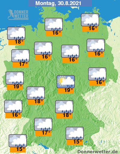 In der kommenden Nacht fällt zunächst vor allem im Süden und Westen weiterer Regen, sonst ist es oft stark, teils auch aufgelockert bewölkt und zunächst meist trocken. Im Laufe der Nacht zieht von der Ostsee her aus Nordosten zum Teil kräftiger Regen herein. In einem Streifen vom Niederrhein bis ins nördliche Bayern bleibt es aber bis zum Morgen hin weitgehend trocken. Die Temperatur sinkt auf 15 Grad in Stralsund und bis 9 Grad in Jena.