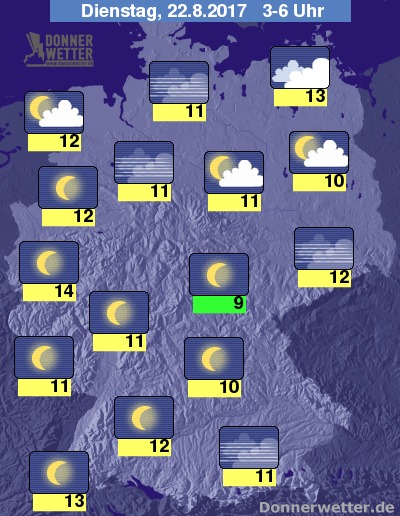 In der folgenden Nacht zeigt sich der Himmel überwiegend sternenklar. Von Brandenburg bis nach Vorpommern sind hier und da noch einige, meist lockere Wolken möglich, es bleibt aber überall trocken. Die Temperatur sinkt auf 14 Grad in der Kölner Bucht und bis 9 Grad im Thüringer Becken.