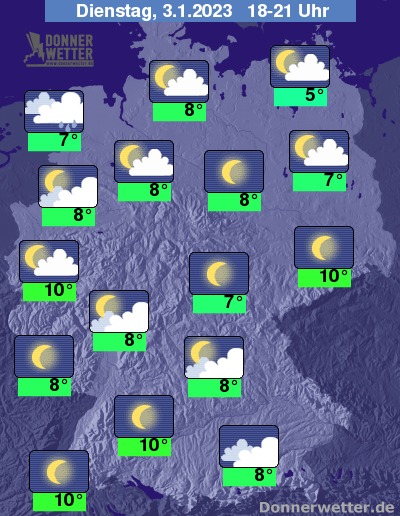 Heute Abend zeigt sich der Himmel über der Republik häufig locker bewölkt oder sogar sternenklar. Dichte Wolken halten sich jedoch im Alpenvorland und vor allem im Nordwesten des Landes, dazu ist hier auch Regen möglich. Im übrigen Land bleibt es trocken bei 5 Grad in Neubrandenburg und rund 10 Grad in Freiburg. Im Nordwesten wird es zunehmend windig und teils stürmisch, an der Nordsee herrscht teils Sturmstärke.