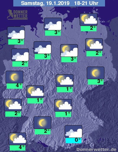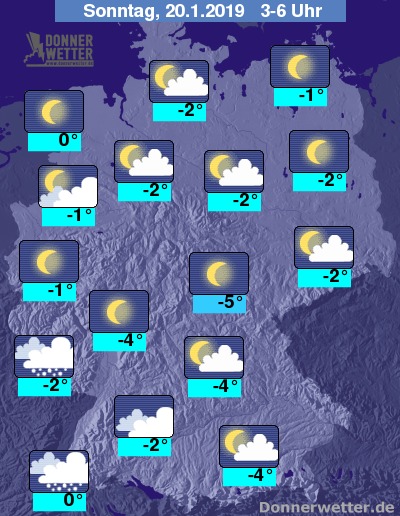 In der Nacht zum Sonntag zeigt sich der Himmel größtenteils locker bewölkt bis sternenklar. Im Südwesten ziehen allerdings dichte Wolken mit möglichen Schneefällen heran, im übrigen Bundesgebiet bleibt es aber trocken. Die Temperatur sinkt auf 0 Grad an der Nordseeküste und bis -5 Grad im Grabfeld.