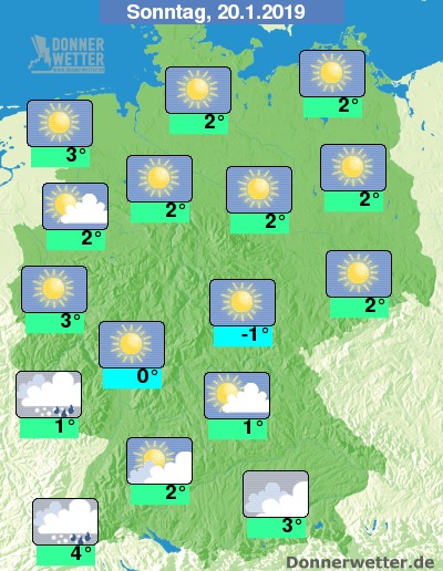 Am Sonntag halten sich im Alpenvorland und über dem Saarland dichte Wolken, die hier gebietsweise Schnee oder Schneeregen bringen. Im übrigen Land ist es dagegen verbreitet heiter bis sonnig und dabei trocken. Die Temperatur erreicht -1 Grad am Thüringer Wald und bis 4 Grad im Breisgau.