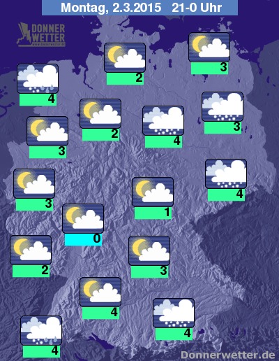 In der Nacht zum Dienstag ist es häufig sternenklar, vor allem im Nordosten und im Südwesten ziehen aber auch teils dichte Wolken durch, es bleibt größtenteils trocken. Die Tiefstwerte liegen bei 3 Grad an der Nordseeküste und bis -1 Grad im Grabfeld. Vor allem in der Nordhälfte des Landes weht weiterhin ein frischer bis starker, in Böen, sowie an der See und auch den Bergen stürmischer Wind. An den Küsten und auf den Bergen sind Sturmböen möglich.