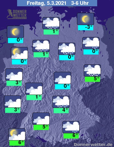 In der Nacht zum Freitag bleibt der Himmel überwiegend wolkenverhangen und mit Ausnahme der westlichen Landesteilen und der küstennahen Regionen fällt zeitweise Regen, der im Nachtverlauf immer häufiger in Schneeregen und Schnee übergeht. Die Temperatur sinkt auf 6 Grad in Freiburg und bis -3 Grad an der Müritz.