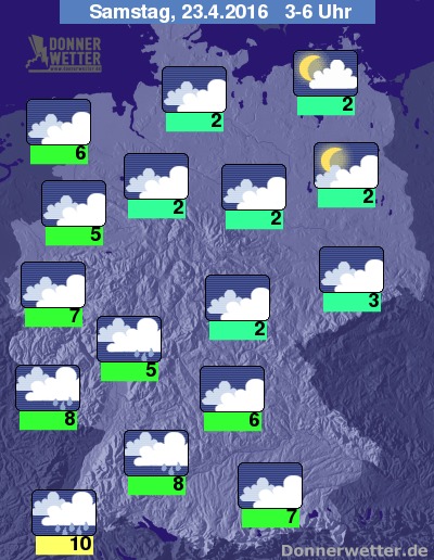 In der folgenden Nacht zieht vom Südwesten bis ins südliche NRW zeitweiliger Regen durch, sonst bleibt es zwar ebenfalls bei meist starker Bewölkung, jedoch ist es dazu trocken. Im Umfeld der Ostsee ist es häufig auch sternenklar. Die Temperatur sinkt auf 10 Grad in Freiburg und bis 2 Grad im Wendland.