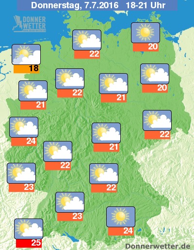 Die Temperaturen erreichen Werte um 21 Grad C an den Küsten und um 28 Grad C am Oberrhein.