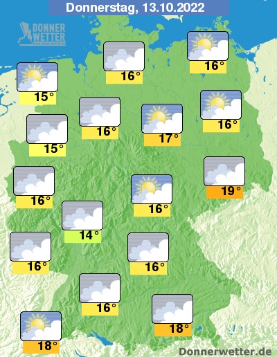 Am Donnerstag ist es teilweise trüb, teils ist es auch etwas aufgelockert bewölkt, dabei bleibt es zunächst weitgehend trocken. Gegen Abend setzt im Süden und Westen dann gebietsweise Regen ein. Die Temperatur erreicht 15 Grad an der Ems und bis 19 Grad in der Lausitz.