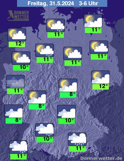 In der Nacht auf Freitag fällt vor allem südlich der Donau immer wieder Regen, sonst sind bei lokalen Auflockerungen vor allem im Norden und Westen noch zeitweise Schauer und einzelne Gewitter möglich.
