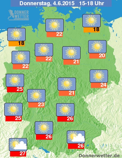 Die Höchstwerte steigen am Nachmittag auf Temperaturen um 18 Grad C an der Ostseeküste und um 27 Grad im Breisgau.