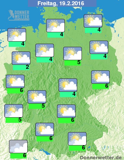 Im Westen und Norden gibt es häufig Sonne bei Werten um 3 Grad C. Nachts bittekalt und Reif bei -5 bis -7 Grad C.