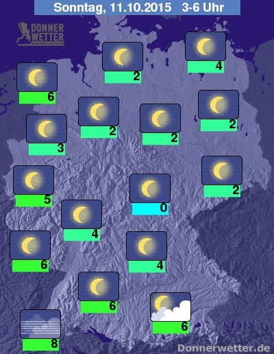 In der kommenden Nacht ist es am Alpenrand meist stark bewölkt, dabei fällt aber nur selten etwas Regen, sonst zeigt sich der Himmel hingegen verbreitet sternenklar und es bleibt überall trocken. Im Süden bildet sich stellenweise Nebel oder Hochnebel. Die Temperaturen sinken auf etwa 8 Grad in Freiburg und auf Werte um 0 Grad im Thüringer Becken.