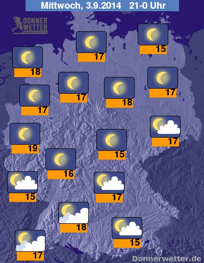 Am Abend bleibt es auch am Alpenrand und Schwarzwald trocken, jedoch lockert die Bewölkung hier meist nur zögerlich weiter auf. Im übrigen Land herrscht ein verbreitet sternenklarer Himmel. Bei Temperaturen von 19 Grad in der Rheinmetropole Köln und 15 Grad an der Isar werden viele Menschen draußen auf wärmere und eher herbstliche Kleidung zurückreifen.