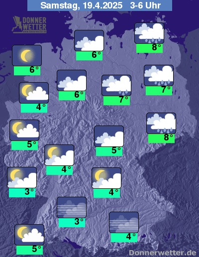 In der Nacht zum Samstag breitet sich der Regen von Sachsen auch weiter auf den überigen Osten und bis in den Nordosten hin aus. Über der übrigen Nordosthälfte bleibt es dicht bewölkt, aber weitgehend trocken. Im Süden und Westen lockert und klart der Himmel immer weiter auf, hier bleibt es trocken. Die Temperatur sinkt auf 8 Grad in der Lausitz und bis 3 Grad in Schwaben.