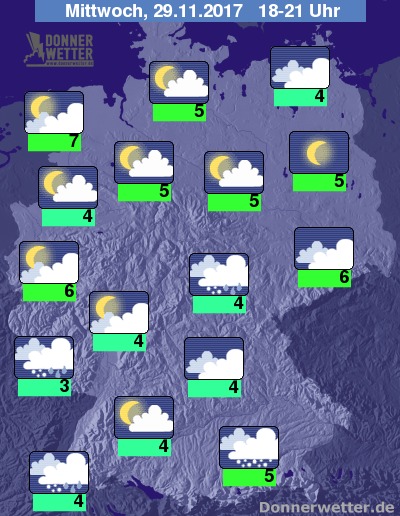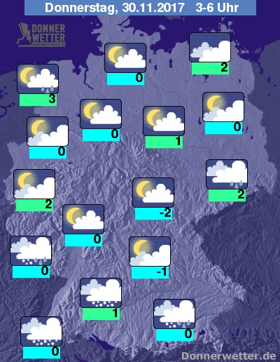 In der Nacht zum Donnerstag bleibt es vor allem im Süden verbreitet bedeckt bei zeitweiligem Regen, Schneeregen oder Schneefall. dazu besteht erhöhte Glättegefahr! Im übrigen Bundesgebiet ist es oft leicht bis aufgelockert und nur hier und da auch dicht bewölkt, dazu bleibt es größtenteils trocken. Die Temperatur sinkt auf 3 Grad in Wilhelmshaven und bis -2 Grad im Eichsfeld.
