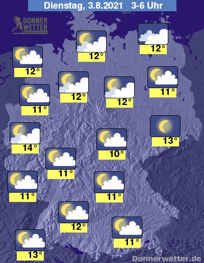 In der Nacht zum Dienstag klingen letzte Schauer verbreitet rasch ab, dazu lockert und klart der Himmel zum Großteil auf. Vor allem im Westen und Süden sowie im Umfeld der Küsten halten sich aber auch oft viele und teils dichte Wolken, dabei sind seltene Schauer möglich. Die Temperatur sinkt auf 14 Grad in der Kölner Bucht und bis 10 Grad im Vogtland.