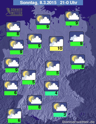 Heute Abend ziehen häufig nur lockere Wolken durch, zeitweise kann es jedoch auch stärker bewölkt sein, dazu bleibt es aber überall trocken. Die Abendtemperatur liegt bei 10 Grad in Magdeburg und um 3 Grad am Alpenrand.